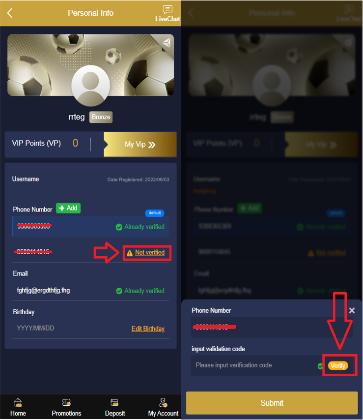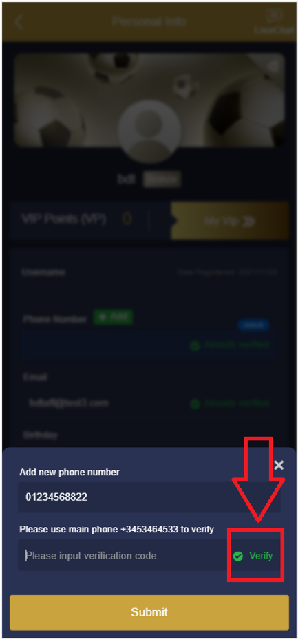 4. After adding the 2nd number, click “not verified” to verify the new number. You will receive a verification code to your new number, enter the verification code then click submit.