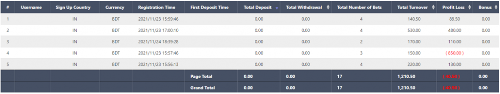 Player’s performance shows the total deposits, withdrawals, bonuses, turnover and profit&loss received by each of your players.